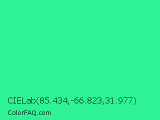 CIELab 85.434,-66.823,31.977 Color is a normal green color and the nearest color is Shamrock #33cc99. Hex code #2df396 and RGB value is rgb(45,243,150). In RGB color space, this color is composed of 18% red, 95% green, 59% blue, In CMYK color space, this color is composed of 81% cyan, 0% magenta, 38% yellow , 5% black , In HSL color space, this color has a hue angle of 152° , 89% saturation and 56% lightness.