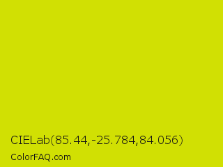 CIELab 85.44,-25.784,84.056 Color is a normal yellow color and the nearest color is Bitter Lemon #cae00d. Hex code #d1e003 and RGB value is rgb(209,224,3). In RGB color space, this color is composed of 82% red, 88% green, 1% blue, In CMYK color space, this color is composed of 7% cyan, 0% magenta, 99% yellow , 12% black , In HSL color space, this color has a hue angle of 64° , 97% saturation and 45% lightness.
