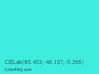 CIELab 85.453,-46.107,-5.266 Color is a normal cyan color and the nearest color is Turquoise #40e0d0. Hex code #3fedde and RGB value is rgb(63,237,222). In RGB color space, this color is composed of 25% red, 93% green, 87% blue, In CMYK color space, this color is composed of 73% cyan, 0% magenta, 6% yellow , 7% black , In HSL color space, this color has a hue angle of 175° , 83% saturation and 59% lightness.