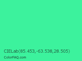 CIELab 85.453,-63.538,28.505 Color is a normal green color and the nearest color is Eucalyptus #44d7a8. Hex code #3cf29d and RGB value is rgb(60,242,157). In RGB color space, this color is composed of 24% red, 95% green, 62% blue, In CMYK color space, this color is composed of 75% cyan, 0% magenta, 35% yellow , 5% black , In HSL color space, this color has a hue angle of 152° , 88% saturation and 59% lightness.