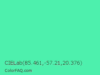 CIELab 85.461,-57.21,20.376 Color is a light green color and the nearest color is Eucalyptus #44d7a8. Hex code #4df0ad and RGB value is rgb(77,240,173). In RGB color space, this color is composed of 30% red, 94% green, 68% blue, In CMYK color space, this color is composed of 68% cyan, 0% magenta, 28% yellow , 6% black , In HSL color space, this color has a hue angle of 155° , 84% saturation and 62% lightness.