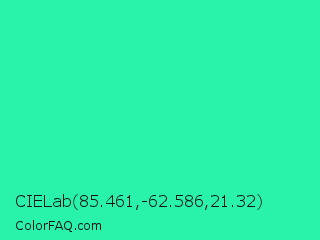 CIELab 85.461,-62.586,21.32 Color is a normal green color and the nearest color is Eucalyptus #44d7a8. Hex code #29f2ab and RGB value is rgb(41,242,171). In RGB color space, this color is composed of 16% red, 95% green, 67% blue, In CMYK color space, this color is composed of 83% cyan, 0% magenta, 29% yellow , 5% black , In HSL color space, this color has a hue angle of 159° , 89% saturation and 55% lightness.
