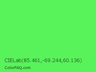 CIELab 85.461,-69.244,60.136 Color is a light green color and the nearest color is Screamin Green #66ff66. Hex code #58f35a and RGB value is rgb(88,243,90). In RGB color space, this color is composed of 35% red, 95% green, 35% blue, In CMYK color space, this color is composed of 64% cyan, 0% magenta, 63% yellow , 5% black , In HSL color space, this color has a hue angle of 121° , 87% saturation and 65% lightness.