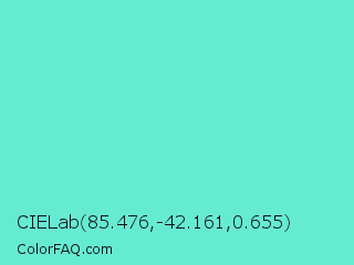 CIELab 85.476,-42.161,0.655 Color is a light cyan color and the nearest color is Aquamarine Blue #71d9e2. Hex code #66ebd3 and RGB value is rgb(102,235,211). In RGB color space, this color is composed of 40% red, 92% green, 83% blue, In CMYK color space, this color is composed of 57% cyan, 0% magenta, 10% yellow , 8% black , In HSL color space, this color has a hue angle of 169° , 77% saturation and 66% lightness.