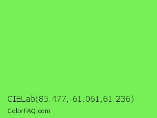 CIELab 85.477,-61.061,61.236 Color is a light green color and the nearest color is Screamin Green #66ff66. Hex code #77f058 and RGB value is rgb(119,240,88). In RGB color space, this color is composed of 47% red, 94% green, 35% blue, In CMYK color space, this color is composed of 50% cyan, 0% magenta, 63% yellow , 6% black , In HSL color space, this color has a hue angle of 108° , 84% saturation and 64% lightness.