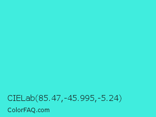 CIELab 85.47,-45.995,-5.24 Color is a normal cyan color and the nearest color is Turquoise #40e0d0. Hex code #40edde and RGB value is rgb(64,237,222). In RGB color space, this color is composed of 25% red, 93% green, 87% blue, In CMYK color space, this color is composed of 73% cyan, 0% magenta, 6% yellow , 7% black , In HSL color space, this color has a hue angle of 175° , 83% saturation and 59% lightness.