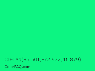 CIELab 85.501,-72.972,41.879 Color is a normal green color and the nearest color is Spring Green #00ff7f. Hex code #0cf582 and RGB value is rgb(12,245,130). In RGB color space, this color is composed of 5% red, 96% green, 51% blue, In CMYK color space, this color is composed of 95% cyan, 0% magenta, 47% yellow , 4% black , In HSL color space, this color has a hue angle of 150° , 92% saturation and 50% lightness.