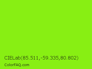 CIELab 85.511,-59.335,80.802 Color is a normal green color and the nearest color is Alien Armpit #84de02. Hex code #88ef13 and RGB value is rgb(136,239,19). In RGB color space, this color is composed of 53% red, 94% green, 7% blue, In CMYK color space, this color is composed of 43% cyan, 0% magenta, 92% yellow , 6% black , In HSL color space, this color has a hue angle of 88° , 87% saturation and 51% lightness.