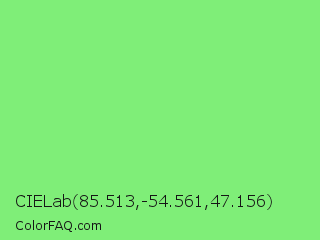 CIELab 85.513,-54.561,47.156 Color is a light green color and the nearest color is Pastel Green #77dd77. Hex code #7fee78 and RGB value is rgb(127,238,120). In RGB color space, this color is composed of 50% red, 93% green, 47% blue, In CMYK color space, this color is composed of 47% cyan, 0% magenta, 50% yellow , 7% black , In HSL color space, this color has a hue angle of 116° , 78% saturation and 70% lightness.