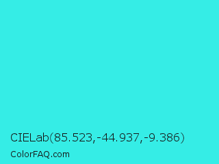 CIELab 85.523,-44.937,-9.386 Color is a normal cyan color and the nearest color is Turquoise #40e0d0. Hex code #35ede6 and RGB value is rgb(53,237,230). In RGB color space, this color is composed of 21% red, 93% green, 90% blue, In CMYK color space, this color is composed of 78% cyan, 0% magenta, 3% yellow , 7% black , In HSL color space, this color has a hue angle of 178° , 84% saturation and 57% lightness.