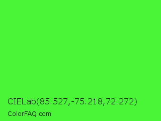 CIELab 85.527,-75.218,72.272 Color is a normal green color and the nearest color is Neon Green #39ff14. Hex code #4af538 and RGB value is rgb(74,245,56). In RGB color space, this color is composed of 29% red, 96% green, 22% blue, In CMYK color space, this color is composed of 70% cyan, 0% magenta, 77% yellow , 4% black , In HSL color space, this color has a hue angle of 114° , 90% saturation and 59% lightness.