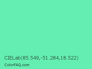CIELab 85.549,-51.284,18.522 Color is a light green color and the nearest color is Medium Aquamarine #66ddaa. Hex code #65eeb1 and RGB value is rgb(101,238,177). In RGB color space, this color is composed of 40% red, 93% green, 69% blue, In CMYK color space, this color is composed of 58% cyan, 0% magenta, 26% yellow , 7% black , In HSL color space, this color has a hue angle of 153° , 80% saturation and 66% lightness.