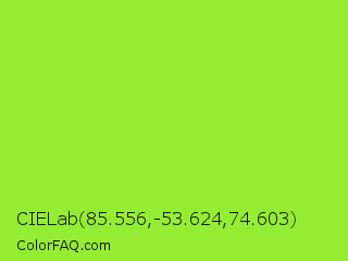 CIELab 85.556,-53.624,74.603 Color is a normal green color and the nearest color is Kiwi #8ee53f. Hex code #94ed33 and RGB value is rgb(148,237,51). In RGB color space, this color is composed of 58% red, 93% green, 20% blue, In CMYK color space, this color is composed of 38% cyan, 0% magenta, 78% yellow , 7% black , In HSL color space, this color has a hue angle of 89° , 84% saturation and 56% lightness.