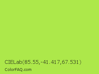 CIELab 85.55,-41.417,67.531 Color is a normal green color and the nearest color is Conifer #acdd4d. Hex code #ade84a and RGB value is rgb(173,232,74). In RGB color space, this color is composed of 68% red, 91% green, 29% blue, In CMYK color space, this color is composed of 25% cyan, 0% magenta, 68% yellow , 9% black , In HSL color space, this color has a hue angle of 82° , 77% saturation and 60% lightness.