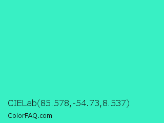 CIELab 85.578,-54.73,8.537 Color is a normal cyan color and the nearest color is Turquoise #40e0d0. Hex code #38f0c4 and RGB value is rgb(56,240,196). In RGB color space, this color is composed of 22% red, 94% green, 77% blue, In CMYK color space, this color is composed of 77% cyan, 0% magenta, 18% yellow , 6% black , In HSL color space, this color has a hue angle of 166° , 86% saturation and 58% lightness.