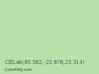 CIELab 85.582,-22.878,23.314 Color is a light green color and the nearest color is Moss Green #addfad. Hex code #bae1a9 and RGB value is rgb(186,225,169). In RGB color space, this color is composed of 73% red, 88% green, 66% blue, In CMYK color space, this color is composed of 17% cyan, 0% magenta, 25% yellow , 12% black , In HSL color space, this color has a hue angle of 102° , 48% saturation and 77% lightness.