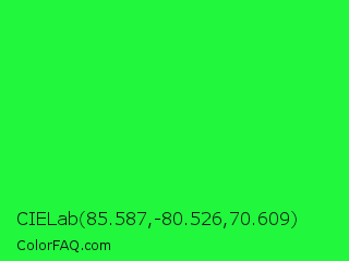 CIELab 85.587,-80.526,70.609 Color is a normal green color and the nearest color is Malachite #0bda51. Hex code #20f73d and RGB value is rgb(32,247,61). In RGB color space, this color is composed of 13% red, 97% green, 24% blue, In CMYK color space, this color is composed of 87% cyan, 0% magenta, 75% yellow , 3% black , In HSL color space, this color has a hue angle of 128° , 93% saturation and 55% lightness.