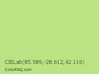 CIELab 85.589,-28.612,42.116 Color is a light green color and the nearest color is Yellow Green #c5e17a. Hex code #bbe384 and RGB value is rgb(187,227,132). In RGB color space, this color is composed of 73% red, 89% green, 52% blue, In CMYK color space, this color is composed of 18% cyan, 0% magenta, 42% yellow , 11% black , In HSL color space, this color has a hue angle of 85° , 63% saturation and 70% lightness.