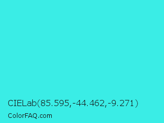 CIELab 85.595,-44.462,-9.271 Color is a normal cyan color and the nearest color is Turquoise #40e0d0. Hex code #3aede6 and RGB value is rgb(58,237,230). In RGB color space, this color is composed of 23% red, 93% green, 90% blue, In CMYK color space, this color is composed of 76% cyan, 0% magenta, 3% yellow , 7% black , In HSL color space, this color has a hue angle of 178° , 83% saturation and 58% lightness.