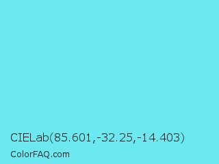 CIELab 85.601,-32.25,-14.403 Color is a light cyan color and the nearest color is Turquoise Blue #6cdae7. Hex code #6ce8f0 and RGB value is rgb(108,232,240). In RGB color space, this color is composed of 42% red, 91% green, 94% blue, In CMYK color space, this color is composed of 55% cyan, 3% magenta, 0% yellow , 6% black , In HSL color space, this color has a hue angle of 184° , 81% saturation and 68% lightness.
