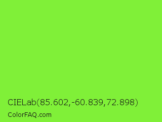 CIELab 85.602,-60.839,72.898 Color is a normal green color and the nearest color is Kiwi #8ee53f. Hex code #80f038 and RGB value is rgb(128,240,56). In RGB color space, this color is composed of 50% red, 94% green, 22% blue, In CMYK color space, this color is composed of 47% cyan, 0% magenta, 77% yellow , 6% black , In HSL color space, this color has a hue angle of 97° , 86% saturation and 58% lightness.