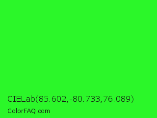 CIELab 85.602,-80.733,76.089 Color is a normal green color and the nearest color is Neon Green #39ff14. Hex code #2bf729 and RGB value is rgb(43,247,41). In RGB color space, this color is composed of 17% red, 97% green, 16% blue, In CMYK color space, this color is composed of 83% cyan, 0% magenta, 83% yellow , 3% black , In HSL color space, this color has a hue angle of 119° , 93% saturation and 56% lightness.