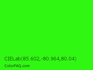 CIELab 85.602,-80.964,80.04 Color is a normal green color and the nearest color is Neon Green #39ff14. Hex code #30f712 and RGB value is rgb(48,247,18). In RGB color space, this color is composed of 19% red, 97% green, 7% blue, In CMYK color space, this color is composed of 81% cyan, 0% magenta, 93% yellow , 3% black , In HSL color space, this color has a hue angle of 112° , 93% saturation and 52% lightness.