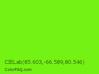 CIELab 85.603,-66.589,80.546 Color is a normal green color and the nearest color is Lawn Green #7cfc00. Hex code #73f213 and RGB value is rgb(115,242,19). In RGB color space, this color is composed of 45% red, 95% green, 7% blue, In CMYK color space, this color is composed of 52% cyan, 0% magenta, 92% yellow , 5% black , In HSL color space, this color has a hue angle of 94° , 90% saturation and 51% lightness.