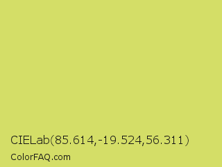 CIELab 85.614,-19.524,56.311 Color is a light yellow color and the nearest color is Booger Buster #dde26a. Hex code #d4de67 and RGB value is rgb(212,222,103). In RGB color space, this color is composed of 83% red, 87% green, 40% blue, In CMYK color space, this color is composed of 5% cyan, 0% magenta, 54% yellow , 13% black , In HSL color space, this color has a hue angle of 65° , 64% saturation and 64% lightness.
