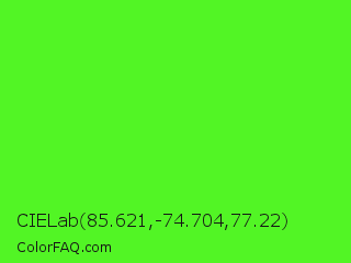 CIELab 85.621,-74.704,77.22 Color is a normal green color and the nearest color is Neon Green #39ff14. Hex code #52f525 and RGB value is rgb(82,245,37). In RGB color space, this color is composed of 32% red, 96% green, 15% blue, In CMYK color space, this color is composed of 67% cyan, 0% magenta, 85% yellow , 4% black , In HSL color space, this color has a hue angle of 107° , 91% saturation and 55% lightness.