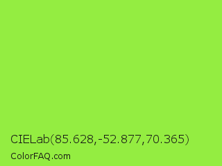 CIELab 85.628,-52.877,70.365 Color is a normal green color and the nearest color is Kiwi #8ee53f. Hex code #94ed41 and RGB value is rgb(148,237,65). In RGB color space, this color is composed of 58% red, 93% green, 25% blue, In CMYK color space, this color is composed of 38% cyan, 0% magenta, 73% yellow , 7% black , In HSL color space, this color has a hue angle of 91° , 83% saturation and 59% lightness.