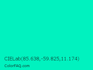 CIELab 85.638,-59.825,11.174 Color is a normal cyan color and the nearest color is Bright Turquoise #08e8de. Hex code #00f2bf and RGB value is rgb(0,242,191). In RGB color space, this color is composed of 0% red, 95% green, 75% blue, In CMYK color space, this color is composed of 100% cyan, 0% magenta, 21% yellow , 5% black , In HSL color space, this color has a hue angle of 167° , 100% saturation and 47% lightness.