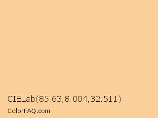 CIELab 85.63,8.004,32.511 Color is a light orange color and the nearest color is Peach Orange #ffcc99. Hex code #facf99 and RGB value is rgb(250,207,153). In RGB color space, this color is composed of 98% red, 81% green, 60% blue, In CMYK color space, this color is composed of 0% cyan, 17% magenta, 39% yellow , 2% black , In HSL color space, this color has a hue angle of 33° , 91% saturation and 79% lightness.