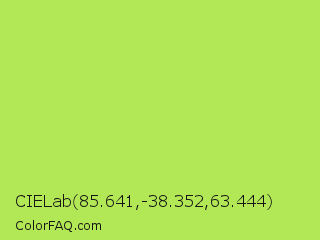 CIELab 85.641,-38.352,63.444 Color is a light green color and the nearest color is Inchworm #b2ec5d. Hex code #b2e755 and RGB value is rgb(178,231,85). In RGB color space, this color is composed of 70% red, 91% green, 33% blue, In CMYK color space, this color is composed of 23% cyan, 0% magenta, 63% yellow , 9% black , In HSL color space, this color has a hue angle of 82° , 75% saturation and 62% lightness.
