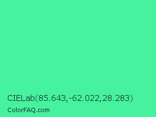 CIELab 85.643,-62.022,28.283 Color is a light green color and the nearest color is Eucalyptus #44d7a8. Hex code #46f29e and RGB value is rgb(70,242,158). In RGB color space, this color is composed of 27% red, 95% green, 62% blue, In CMYK color space, this color is composed of 71% cyan, 0% magenta, 35% yellow , 5% black , In HSL color space, this color has a hue angle of 151° , 87% saturation and 61% lightness.