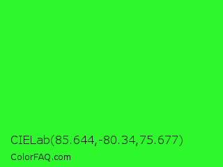 CIELab 85.644,-80.34,75.677 Color is a normal green color and the nearest color is Neon Green #39ff14. Hex code #2ef72b and RGB value is rgb(46,247,43). In RGB color space, this color is composed of 18% red, 97% green, 17% blue, In CMYK color space, this color is composed of 81% cyan, 0% magenta, 83% yellow , 3% black , In HSL color space, this color has a hue angle of 119° , 93% saturation and 57% lightness.