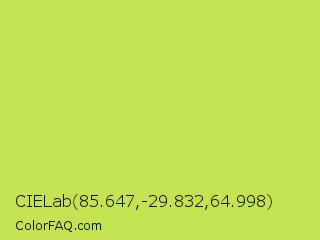 CIELab 85.647,-29.832,64.998 Color is a light lime color and the nearest color is June Bud #bdda57. Hex code #c4e352 and RGB value is rgb(196,227,82). In RGB color space, this color is composed of 77% red, 89% green, 32% blue, In CMYK color space, this color is composed of 14% cyan, 0% magenta, 64% yellow , 11% black , In HSL color space, this color has a hue angle of 73° , 72% saturation and 61% lightness.
