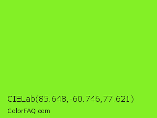 CIELab 85.648,-60.746,77.621 Color is a normal green color and the nearest color is Spring Frost #87ff2a. Hex code #83f026 and RGB value is rgb(131,240,38). In RGB color space, this color is composed of 51% red, 94% green, 15% blue, In CMYK color space, this color is composed of 45% cyan, 0% magenta, 84% yellow , 6% black , In HSL color space, this color has a hue angle of 92° , 87% saturation and 55% lightness.