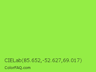 CIELab 85.652,-52.627,69.017 Color is a normal green color and the nearest color is Kiwi #8ee53f. Hex code #94ed45 and RGB value is rgb(148,237,69). In RGB color space, this color is composed of 58% red, 93% green, 27% blue, In CMYK color space, this color is composed of 38% cyan, 0% magenta, 71% yellow , 7% black , In HSL color space, this color has a hue angle of 92° , 82% saturation and 60% lightness.
