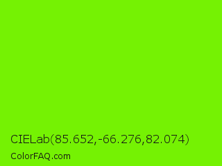 CIELab 85.652,-66.276,82.074 Color is a normal green color and the nearest color is Lawn Green #7cfc00. Hex code #75f203 and RGB value is rgb(117,242,3). In RGB color space, this color is composed of 46% red, 95% green, 1% blue, In CMYK color space, this color is composed of 52% cyan, 0% magenta, 99% yellow , 5% black , In HSL color space, this color has a hue angle of 91° , 98% saturation and 48% lightness.