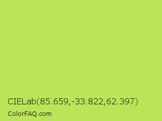 CIELab 85.659,-33.822,62.397 Color is a light lime color and the nearest color is June Bud #bdda57. Hex code #bbe558 and RGB value is rgb(187,229,88). In RGB color space, this color is composed of 73% red, 90% green, 35% blue, In CMYK color space, this color is composed of 18% cyan, 0% magenta, 62% yellow , 10% black , In HSL color space, this color has a hue angle of 78° , 73% saturation and 62% lightness.