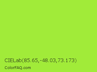 CIELab 85.65,-48.03,73.173 Color is a normal green color and the nearest color is Green Lizard #a7f432. Hex code #a1eb39 and RGB value is rgb(161,235,57). In RGB color space, this color is composed of 63% red, 92% green, 22% blue, In CMYK color space, this color is composed of 31% cyan, 0% magenta, 76% yellow , 8% black , In HSL color space, this color has a hue angle of 85° , 82% saturation and 57% lightness.