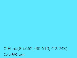 CIELab 85.662,-30.513,-22.243 Color is a light cyan color and the nearest color is Turquoise Blue #6cdae7. Hex code #5ee8ff and RGB value is rgb(94,232,255). In RGB color space, this color is composed of 37% red, 91% green, 100% blue, In CMYK color space, this color is composed of 63% cyan, 9% magenta, 0% yellow , 0% black , In HSL color space, this color has a hue angle of 189° , 100% saturation and 68% lightness.