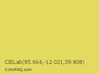 CIELab 85.664,-12.021,59.808 Color is a light yellow color and the nearest color is Confetti #e9d75a. Hex code #e3da60 and RGB value is rgb(227,218,96). In RGB color space, this color is composed of 89% red, 85% green, 38% blue, In CMYK color space, this color is composed of 0% cyan, 4% magenta, 58% yellow , 11% black , In HSL color space, this color has a hue angle of 56° , 70% saturation and 63% lightness.