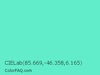 CIELab 85.669,-46.358,6.165 Color is a light cyan color and the nearest color is Downy #6fd0c5. Hex code #61edc9 and RGB value is rgb(97,237,201). In RGB color space, this color is composed of 38% red, 93% green, 79% blue, In CMYK color space, this color is composed of 59% cyan, 0% magenta, 15% yellow , 7% black , In HSL color space, this color has a hue angle of 165° , 80% saturation and 65% lightness.