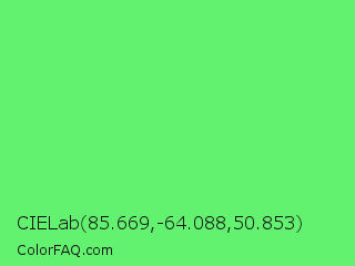 CIELab 85.669,-64.088,50.853 Color is a light green color and the nearest color is Screamin Green #66ff66. Hex code #63f270 and RGB value is rgb(99,242,112). In RGB color space, this color is composed of 39% red, 95% green, 44% blue, In CMYK color space, this color is composed of 59% cyan, 0% magenta, 54% yellow , 5% black , In HSL color space, this color has a hue angle of 125° , 85% saturation and 67% lightness.