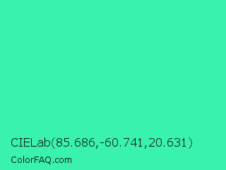 CIELab 85.686,-60.741,20.631 Color is a normal green color and the nearest color is Eucalyptus #44d7a8. Hex code #38f2ad and RGB value is rgb(56,242,173). In RGB color space, this color is composed of 22% red, 95% green, 68% blue, In CMYK color space, this color is composed of 77% cyan, 0% magenta, 29% yellow , 5% black , In HSL color space, this color has a hue angle of 158° , 88% saturation and 58% lightness.