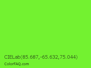 CIELab 85.687,-65.632,75.044 Color is a normal green color and the nearest color is Spring Frost #87ff2a. Hex code #73f230 and RGB value is rgb(115,242,48). In RGB color space, this color is composed of 45% red, 95% green, 19% blue, In CMYK color space, this color is composed of 52% cyan, 0% magenta, 80% yellow , 5% black , In HSL color space, this color has a hue angle of 99° , 88% saturation and 57% lightness.