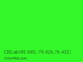 CIELab 85.695,-79.926,76.432 Color is a normal green color and the nearest color is Neon Green #39ff14. Hex code #33f728 and RGB value is rgb(51,247,40). In RGB color space, this color is composed of 20% red, 97% green, 16% blue, In CMYK color space, this color is composed of 79% cyan, 0% magenta, 84% yellow , 3% black , In HSL color space, this color has a hue angle of 117° , 93% saturation and 56% lightness.