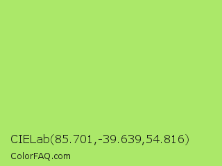 CIELab 85.701,-39.639,54.816 Color is a light green color and the nearest color is Inchworm #b2ec5d. Hex code #abe869 and RGB value is rgb(171,232,105). In RGB color space, this color is composed of 67% red, 91% green, 41% blue, In CMYK color space, this color is composed of 26% cyan, 0% magenta, 55% yellow , 9% black , In HSL color space, this color has a hue angle of 89° , 73% saturation and 66% lightness.